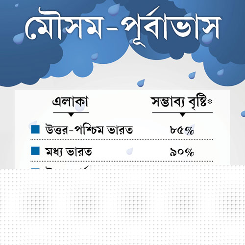 সব মিলিয়ে ভারতের বর্ষা–ভাগ্যে আশঙ্কারই ছায়া। মৌসম ভবনের পূর্বাভাস, সর্বাধিক ভুগবে উত্তর-পশ্চিম ভারত, যেখানে সম্ভাব্য বৃষ্টিপাত স্বাভাবিকের ৮৫%। একেই শীতের শেষে ওই তল্লাটে লাগাতার বৃষ্টিতে ফসল নষ্ট হয়েছে। প্রবল গ্রীষ্মে ফুটিফাটা মাঠে চাষও বিপর্যস্ত। খরা-দুর্গত মধ্য ভারতে স্বাভাবিকের ৯০% বৃষ্টির পূর্বাভাস, উত্তর-পূর্বে স্বাভাবিকের ৯০%। তুলনায় দক্ষিণ ভারত বেশি বৃষ্টি পেতে পারে— স্বাভাবিকের ৯২%।