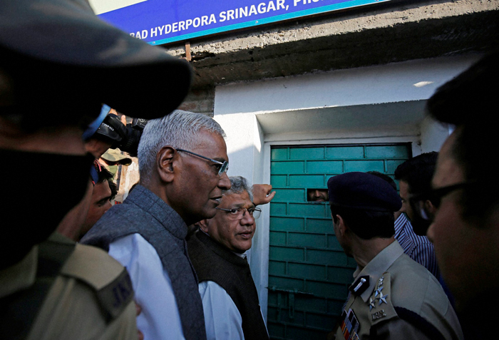রবিবার শ্রীনগরে এ ভাবেই গিলানির বাড়ির বাইরে দাঁড়িয়ে ছিলেন সীতারাম ইয়েচুরি, ডি রাজা। গিলানি দরজা খোলেননি। ছবি: পিটিআই।