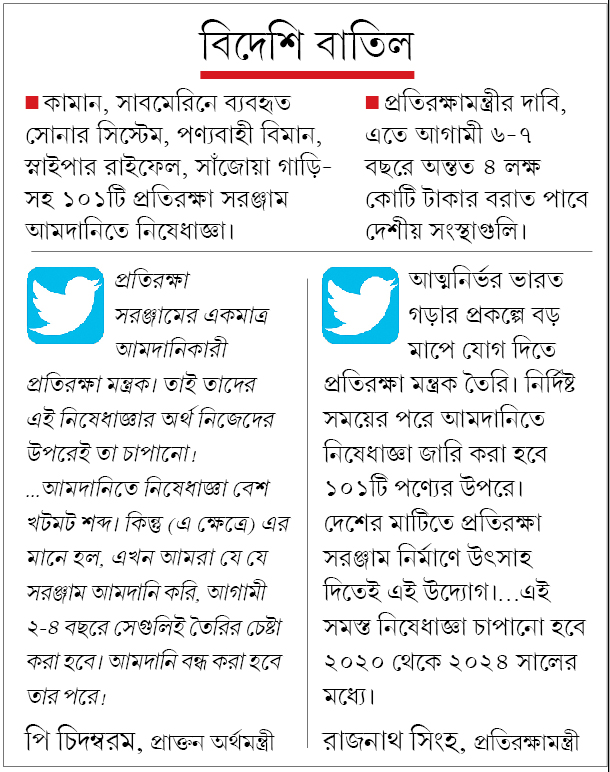 রবিবার একগুচ্ছ টুইটে প্রতিরক্ষামন্ত্রী রাজনাথ সিংহ জানান, প্রধানমন্ত্রী ‘আত্মনির্ভর ভারত’ গড়ার যে ডাক দিয়েছেন, তাতে শামিল হতেই এই সিদ্ধান্ত। এমন নয় যে, এখনই এক লপ্তে এই সমস্ত পণ্য আমদানিতে নিষেধাজ্ঞা জারি করা হচ্ছে। বরং তার প্রত্যেকটির জন্য নির্দিষ্ট সময়সীমা চিহ্নিত করা হয়েছে। সেই অনুযায়ী এগুলির আমদানি ধাপে ধাপে বন্ধ করা হবে ২০২০ থেকে ২০২৪ সালের মধ্যে। অর্থাৎ আগামী লোকসভা ভোটের আগে মোদীর দ্বিতীয় দফার সরকারের মেয়াদের মধ্যেই এটা করতে চায় কেন্দ্র। এতে আগামী ৬-৭ বছরে অন্তত ৪ লক্ষ কোটি টাকার বরাত বাইরে যাওয়ার বদলে ভারতীয় সংস্থাগুলি পাবে বলেও দাবি প্রতিরক্ষামন্ত্রীর। স্থল ও বিমান বাহিনীর তরফ থেকে ১.৩ লক্ষ কোটি টাকা করে। আর নৌবাহিনী থেকে ১.৪ লক্ষ কোটির।
