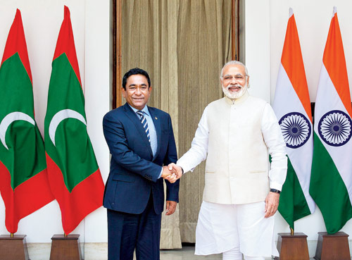 মলদ্বীপের প্রেসিডেন্ট ইয়ামিন আব্দুল গায়ুমের সঙ্গে প্রধানমন্ত্রী নরেন্দ্র মোদী।