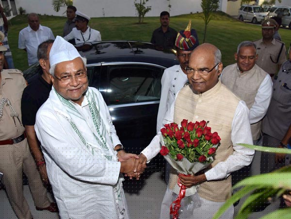 ইফতার পার্টিতে রাজ্যপাল রামনাথ কোবিন্দকে সংবর্ধনা জানাচ্ছেন নীতীশ কুমার। শনিবার পটনায়। ছবি: পিটিআই।