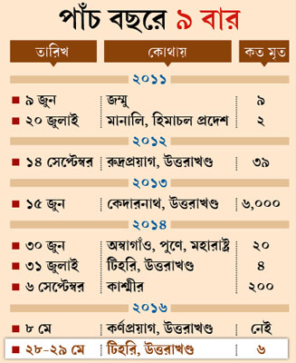 তিন বছর আগে মেঘ ভাঙা বৃষ্টি, হড়পা বান ও ধসে অন্তত ৬ হাজার মানুষের মৃত্যু হয়েছিল। ২০০৪ সালের সুনামির পর সেটিই ছিল ভারতের সব চেয়ে মারাত্মক প্রাকৃতিক দুর্যোগ। তবে কপালের ভাঁজ মুছছে না প্রশাসনের। ২৪ ঘণ্টাতেও বৃষ্টি না থামায় এ বারের দুর্যোগে মৃতের সংখ্যা আরও বাড়তে পারে বলে আশঙ্কা করা হচ্ছে। উদ্ধার ও রাস্তা খোলার কাজ শুরু হলেও ভারী বৃষ্টি ও ধস বড় বাধা হয়ে দাঁড়িয়েছে।