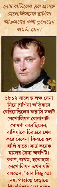 নগদে থাকা ৬-৭ শতাংশ কালো টাকাকে পিষে মারতে বাজার থেকে ৮৬% নোট তুলে নেওয়া যে বিরাট ভুল, এ দিন তা বহু বার বলেছেন অমর্ত্যবাবু। কালো টাকা, জাল নোট, কিংবা ডিজিটাল লেনদেনের প্রসার— কোনও যুক্তিই ওই সিদ্ধান্তের পক্ষে ধোপে টেকে না বলে মনে করেন তিনি। বরং নোট বাতিল নিয়ে কেন্দ্র ও রিজার্ভ ব্যাঙ্কের লাগাতার সিদ্ধান্ত বদলে যাওয়ার কারণে ব্যাঙ্কিং ব্যবস্থার প্রতি আমজনতার আস্থা জোরদার ভাবে ধাক্কা খেতে পারে বলে তাঁর আশঙ্কা। তাহলে এ নিয়ে সাধারণ মানুষের ভুল ভাঙলে, কী জবাবদিহি করবে মোদী সরকার? উত্তরে ফরাসি সম্রাট নেপোলিয়নের উদাহরণ টানছেন অমর্ত্যবাবু। বলছেন, রাশিয়া দখল করতে গিয়ে শোচনীয় পরাজয়ের পরে নেপোলিয়ন যদি বলতেন যে, আর তো কিছু করতে যাইনি। শুধু বরফ ঢাকা পাহাড় দেখতে গিয়েছিলাম! এ ক্ষেত্রেও ব্যাপারটা কিছুটা সেই রকমই।