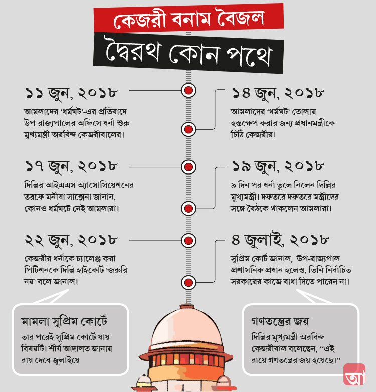 এর পর লেফটেন্যান্ট গভর্নর বৈজল তাঁর অফিসে ধর্নায় বসা মুখ্যমন্ত্রী কেজরীবালের সঙ্গে কথা বলেন। আমলারা যাতে সরকারের সঙ্গে সব রকমের সহযোগিতা করেন, সে ব্যাপারে লেফটেন্যান্ট গভর্নরের অফিস থেকে একটি বিজ্ঞপ্তি জারি করা হয়। তার পর ধর্না তুলে নেন দিল্লির মুখ্যমন্ত্রী। কিন্তু আমলাদের অসহযোগিতায় কেন প্রশাসনিক কাজকর্মে ব্যাঘাত ঘটল, কেন আমজনতাকে চরম দুর্ভোগ সইতে হল, তা নিয়ে একটি পিটিশন হয় দিল্লি হাইকোর্টে। কিন্তু মুখ্যমন্ত্রীর ধর্না আর আমলাদের ধর্মঘট, দু’টিই উঠে গিয়েছে, এই যুক্তি দেথিয়ে দিল্লি হাইকোর্ট বলে, ওই পিটিশনের শুনানি খুব জরুরি নয়। তখন পিটিশন যায় সুপ্রিম কোর্টে। ওই সময়েই শীর্য আদালত বলেছিল, এ ব্যাপারে রায় দেওয়া হবে জুলাইয়ে।