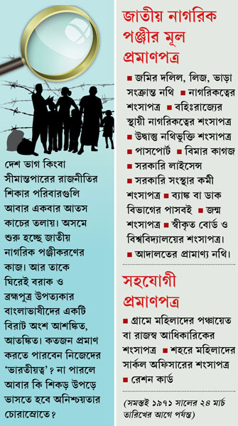 অসমে জাতীয় নাগরিক পঞ্জী নবীকরণের (এনআরসি) সময় ঘোষণা করা হয়েছে। এ বার এই রাজ্যের বাংলাভাষীদের ভারতীয় নাগরিকত্বের প্রমাণ দিতে হবে। আবেদনকারী নিজে বা তাঁর পূর্বপুরুষ ১৯৭১ সালের ২৪ মার্চের আগে থেকে ভারতে রয়েছেন, এমন নথি দেখতে চাইবে সরকার। এ নিয়েই ছড়িয়েছে দুশ্চিন্তা। অধিকাংশ মানুষের কাছেই ওই সময়ের কোনও নথি নেই। এত আগের কাগজ জোগাড় করাও সহজ নয়। এতে নতুন সঙ্কটে বরাক-ব্রহ্মপুত্রের বাংলাভাষীরা। তাঁদের আশঙ্কা, নথির অভাবে সকলকে ভিন্দেশি হিসেবে না চিহ্নিত করা হয়।