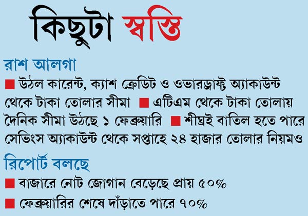 এ দিন রিজার্ভ ব্যাঙ্ক জানিয়েছে, বাজারে পর্যাপ্ত পরিমাণে নোট ফিরে আসার বিষয়টি খতিয়ে দেখার পরেই বর্তমানে টাকা তোলার উপর জারি থাকা নিয়ন্ত্রণ আংশিক ভাবে প্রত্যাহারের এই সিদ্ধান্ত নিয়েছে তারা। একই সঙ্গে তাদের প্রতিশ্রুতি, আগামী দিনে নোট ফেরার গতি আর কতটা বাড়ে তা দেখে নিয়ে শীঘ্রই তুলে নেওয়া হতে পারে সেভিংস অ্যাকাউন্ট থেকে টাকা তোলার সাপ্তাহিক সীমাও। উল্লেখ্য, গত সপ্তাহে তারা জানিয়েছিল, নতুন নোট ঢুকেছে প্রায় ৯.৮ লক্ষ কোটির টাকার।