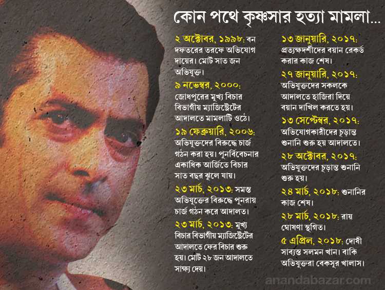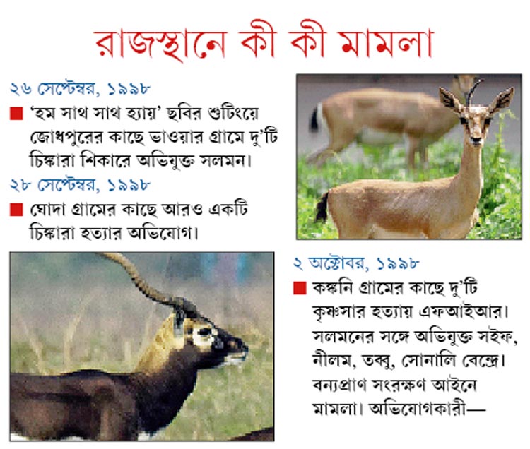 ১৯৯৮ সালে জোধপুরে ‘হাম সাথ সাথ হ্যায়’ ছবির শুটিংয়ের ফাঁকে ১ অক্টোবর মাঝরাতে সইফ, তব্বু, সোনালি ও নীলমের সঙ্গে একটি মারুতি জিপসিতে বেরিয়েছিলেন সলমন। অভিযোগ, সেই সময়েই জোধপুরের কাছে বিশ্নোই সম্প্রদায়ের কঙ্কনি গ্রামে নিজের রাইফেল থেকে গুলি করে দু’টি কৃষ্ণসার হরিণ মারেন তিনি। কৃষ্ণসার বিপন্ন প্রাণী। বিশ্নোইরা কৃষ্ণসারের রক্ষক হিসেবে মনে করেন নিজেদের। সলমনের জিপসির নম্বর পুলিশকে দিয়েছিলেন তাঁরা। বন্যপ্রাণ আইনে ২০ বছর ধরে মামলা তাঁরাই চালিয়েছেন। প্রায় একই সময়ে রাজস্থানে চিঙ্কারা হরিণ শিকারেরও অভিযোগ ওঠে সলমনের বিরুদ্ধে। আছে মুম্বইয়ে মদ্যপ অবস্থায় গাড়ি চাপা দিয়ে এক ফুটপাথবাসীর মৃত্যু ঘটানোর অভিযোগও। সেই দু’টি মামলা এখন সুপ্রিম কোর্টে।