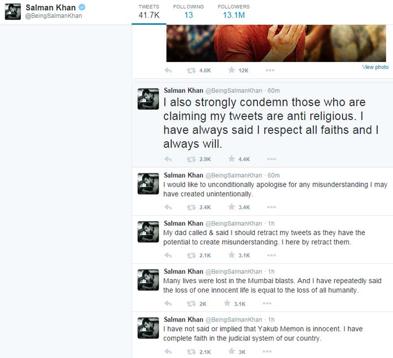 সিপিএম এর বিরোধিতা করলেও প্রকাশ্যে এ ভাবে ইয়াকুবের সপক্ষে মুখ খোলেননি দলীয় নেতৃত্বের কেউই। কিন্তু, ইয়াকুবের পক্ষ নিয়ে টুইটে নজিরবিহীন ভাবে নিজের মতপ্রকাশ করেন সলমন। পলাতক টাইগারকেই দোষী বলে টুইট করেন তিনি। এমনকী, পাকিস্তানে টাইগার আত্মগোপন করে থাকলে তাকে ফেরানোর জন্য পাক প্রধানমন্ত্রী নওয়াজ শরিফকেও টুইটারেই আর্জি জানান তিনি।