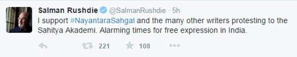 দাদরি-কাণ্ডের জেরে এ বার প্রতিবাদে মুখর হলেন লেখক সলমন রুশদি। সোমবার টুইট করে রুশদি বলেন, “নয়নতারা সহগল-সহ অন্য সাহিত্যিকদের প্রতিবাদের সিদ্ধান্তকে আমি সমর্থন করি। স্বাধীন মতপ্রকাশের ক্ষেত্রে ভারতে এখন খুবই উদ্বেগজনক সময়।”