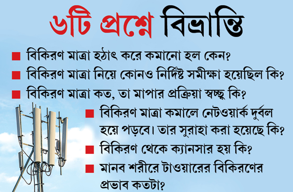 টেলিকম মন্ত্রকের একাংশের ওই দাবি সত্যি বলে মানছেন অনেকেই। কিন্তু তাঁদের মতে, এই বিকিরণ মাত্রা আদৌ কমানো হচ্ছে কি না, তা নিয়ে সন্দেহ থাকছে। যাদবপুর বিশ্ববিদ্যালয়ের ইলেকট্রনিক্স ও টেলিকমিউনিকেশন ইঞ্জিনিয়ারিংয়ের অধ্যাপক ভাস্কর গুপ্তের দাবি, বিকিরণ মাত্রা কমানো হয়েছে কি না, তা সরকার পরীক্ষা করে না। টেলিকম সংস্থাগুলিই নিজেদের শংসাপত্র দেয়। এই ব্যবস্থা কতটা স্বচ্ছ তা নিয়ে প্রশ্ন উঠতে পারে। ভাস্করবাবুর কথায়, ‘‘এই যে বিকিরণ মাত্রা এক ধাক্কায় একের দশ ভাগ করা হল, তা কি যথেষ্ট?’’ তিনি বলছেন, বিকিরণ মাত্রা কমানো হলে টাওয়ারের ‘কভারেজ’ এলাকা কমে। ফলে নেটওয়ার্ক দুর্বল হতে পারে। এই সমস্যা কাটাতে কম বিকিরণ মাত্রার বেশি টাওয়ার বসানো উচিত বলে তাঁর মত। তাঁর ব্যাখ্যা, কম বিকিরণ মাত্রার টাওয়ারে ক্ষতি হবে না। নেটওয়ার্কও জোরালো থাকবে।