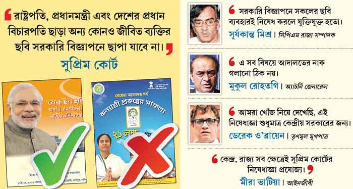 বুধবার সুপ্রিম কোর্ট জানিয়েছে, সরকারি বিজ্ঞাপনে রাষ্ট্রপতি, প্রধানমন্ত্রী বা ভারতের প্রধান বিচারপতি ছাড়া আর কারও ছবিই ব্যবহার করা যাবে না। বাদ পড়বেন মুখ্যমন্ত্রী, রাজ্যপাল বা কেন্দ্রীয় মন্ত্রীরা। ফলত যা দাঁড়াল, তাতে পশ্চিমবঙ্গে মমতার ছবিওয়ালা সরকারি বিজ্ঞাপনগুলিও বাতিল করতে হবে।