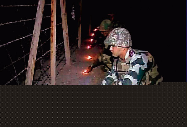 সীমান্তে জওয়ানদের দীপাবলি। জম্মুর আর এস পুরা সেক্টরে। ছবি: পি টি আই
