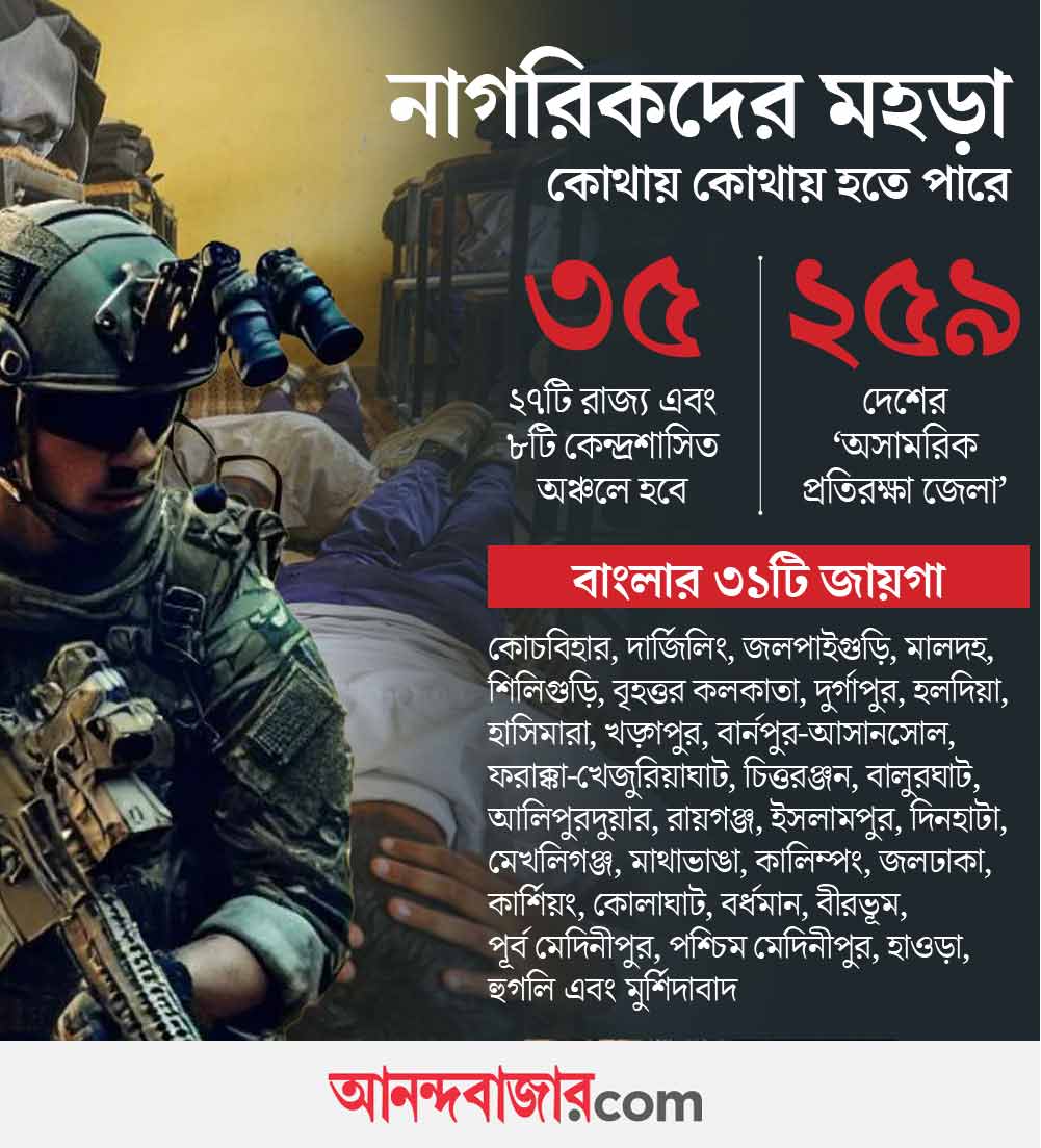 যুদ্ধকালীন পরিস্থিতিতে কী করা যাবে, আর কী করা যাবে না, সাধারণ নাগরিকদের সচেতনতার পাঠ দিতে দেশ জুড়ে অসামরিক মহড়া হতে চলেছে বুধবার। কেন্দ্রীয় স্বরাষ্ট্র মন্ত্রকের ২০১০ সালের একটি বিজ্ঞপ্তি অনুযায়ী দেশের ২৭টি রাজ্য এবং আটটি কেন্দ্রশাসিত অঞ্চলে মোট ২৫৯টি ‘অসামরিক প্রতিরক্ষা জেলা’ বা ‘সিভিল ডিফেন্স ডিস্ট্রিক্ট’ রয়েছে। তালিকায় রয়েছে পশ্চিমবঙ্গের ৩১টি জায়গাও। কেন্দ্র রাজ্যগুলিকে মহড়ার জন্য প্রস্তুত থাকতে বলেছে। এই প্রেক্ষিতে মনে করা হচ্ছে এই জেলাগুলিতেও অসামরিক মহড়া চলবে। ১৯৭১ সালের ভারত-পাকিস্তান যুদ্ধের পর এই প্রথম দেশ জুড়ে এমন অসামরিক মহড়া হতে চলেছে।