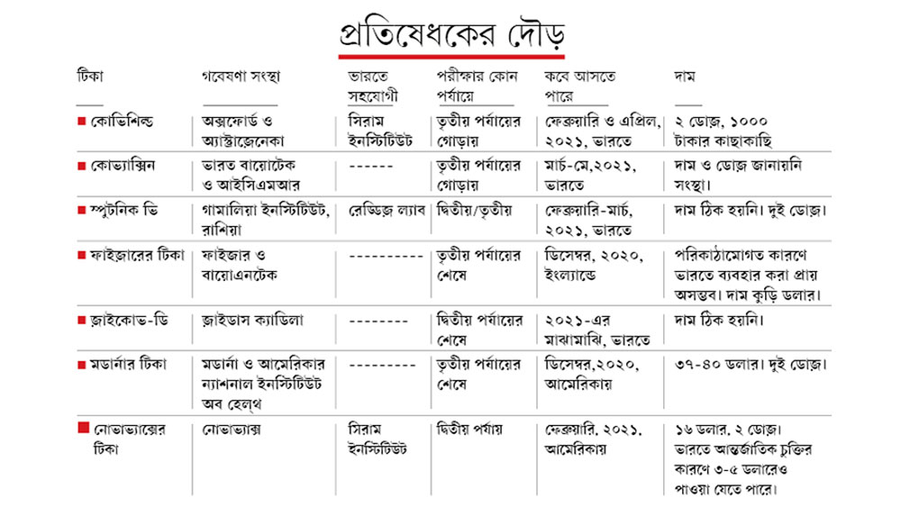 বর্তমানে দেশি ও বিদেশি মিলিয়ে প্রায় পাঁচ থেকে সাতটি প্রতিষেধকের শেষ পর্যায়ের প্রয়োগ চলছে। এর মধ্যে দৌড়ে সব চেয়ে এগিয়ে রয়েছে ফাইজ়ার ও মডার্না সংস্থা। ফাইজ়ারের দাবি, তাদের প্রতিষেধকে প্রায় ৯৫ শতাংশ কার্যকারিতা লক্ষ্য করা গিয়েছে। প্রথমে আমেরিকার বাজারে আসতে চলেছে ওই প্রতিষেধক। তবে ভারতে তা নিয়ে আশা দেখছেন না প্রতিষেধক বিষয়ক বিশেষজ্ঞ কমিটির অন্যতম কর্তা বিনোদকুমার পল। তিনি বলেন, ‘‘ওই টিকা সংরক্ষণের জন্য মাইনাস ৭০ থেকে মাইনাস ৮০ ডিগ্রি সেলসিয়াস তাপমাত্রার প্রয়োজন। ভারতের মতো অন্য অনেক দেশেরই পক্ষে এ ধরনের কোল্ড চেন গড়ে তোলা কার্যত অসম্ভব।’’ মডার্নার টিকা মূলত আমেরিকার বাজারের কথা মাথায় রেখেই বানানো হয়েছে। সেটিও আগামী মাসে বাজারে আসতে চলেছে। ভারতে বিদেশি প্রতিষেধকের পরীক্ষামূলক প্রয়োগ সফল না-হওয়া পর্যন্ত তা বাজারে ছাড়া যায় না। ওই দুই সংস্থা এখনও ভারতে পরীক্ষামূলক প্রয়োগে আগ্রহ না-দেখানোয় ওই টিকাগুলি নিয়ে আপাতত উৎসাহ দেখাচ্ছে না কেন্দ্রও।