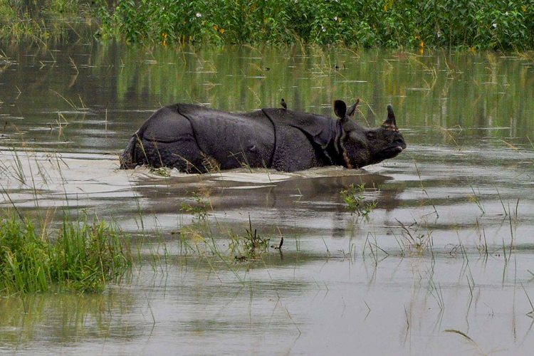 জল ঢুকে পড়েছে মরিগাঁওয়ের পবিতোরা অভয়ারণ্যেও। ছবি: পিটিআই।