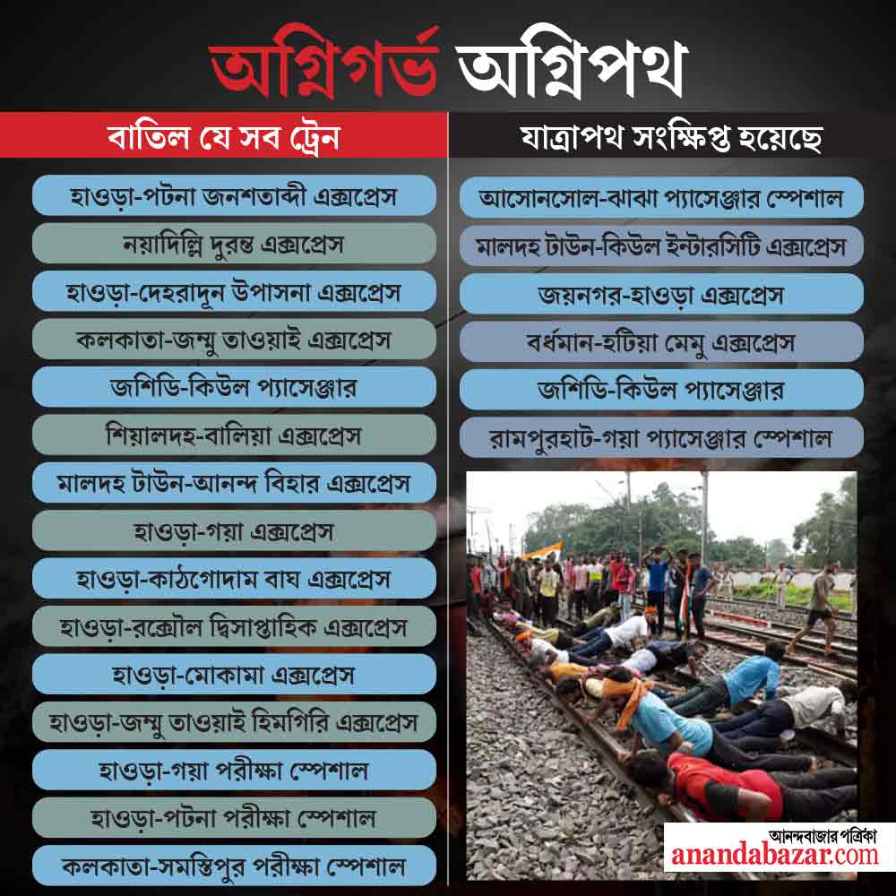 ভারতীয় সেনার সশস্ত্র বাহিনীতে চুক্তিভিত্তিক নিয়োগের অগ্নিপথ প্রকল্পের বিরোধিতায় দেশ জুড়ে শুরু হয়েছে তুমুল বিক্ষোভ। কোথাও উপমুখ্যমন্ত্রীর বাড়িতে আছড়ে পড়ছে উন্মত্ত নিয়োগপ্রার্থীদের ক্ষোভ, কোথাও আবার তরুণদের বিক্ষোভ সামলাতে গুলি চালাতে হচ্ছে নিরাপত্তারক্ষীদের। তাতে ঝরছে তাজা প্রাণ। তবে বিক্ষোভের জেরে অন্যান্য সময়ের মতো এ বারও সবচেয়ে বেশি ক্ষতিগ্রস্ত রেলপথ। বলা ভাল, রেলপথই যেন হয়ে উঠেছে অগ্নিপথ!
