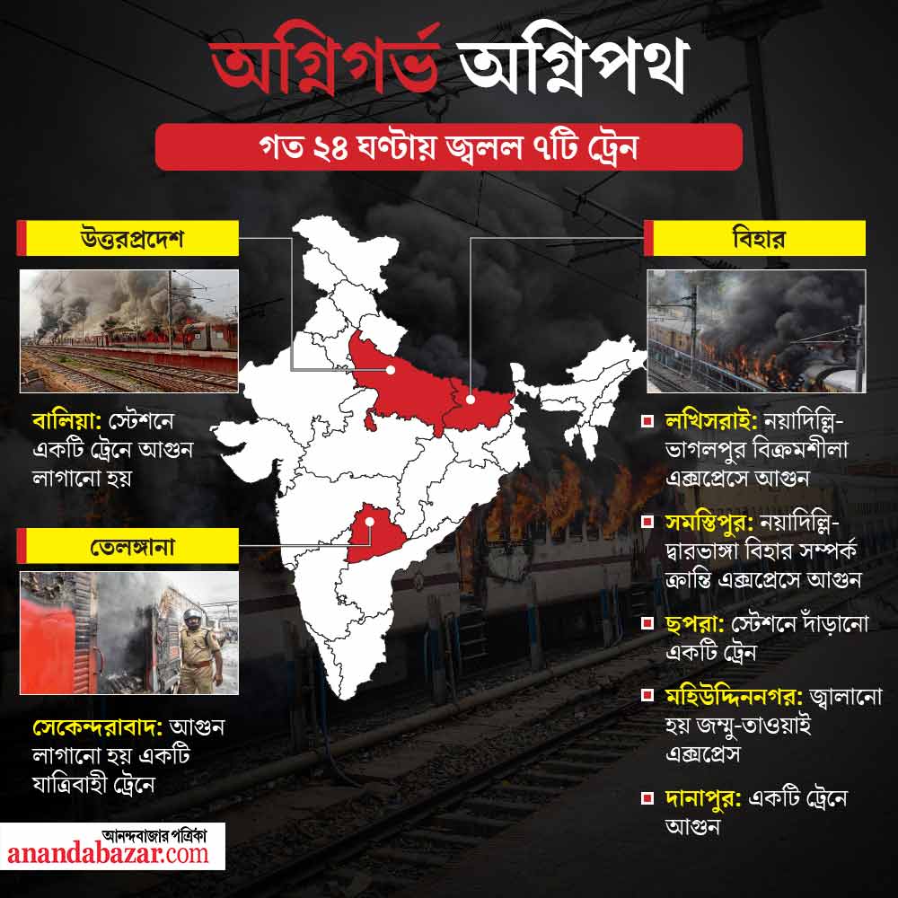 বিহার, উত্তরপ্রদেশ, হরিয়ানা, তেলঙ্গানা-সহ দেশের ১২টি রাজ্যে ছড়িয়ে পড়েছে অগ্নিপথের আঁচ। দাউদাউ করে জ্বলছে ট্রেন। রাস্তায় ইট-পাথরের ছড়াছড়ি। বিপর্যস্ত জনজীবন। শতচ্ছিন্ন রেল যোগাযোগ।