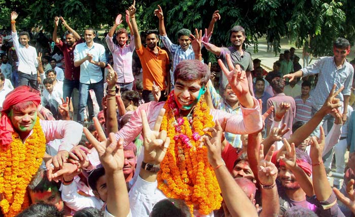 ইলাহাবাদ বিশ্ববিদ্যালয়ের ছাত্র সংসদ নির্বাচনে বিপুল জয়ের পর সমাজবাদী ছাত্র সভার উল্লাস। ছবি: পিটিআই।