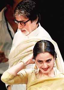 পুরস্কার প্রাপ্তির অনুষ্ঠানে তবু এক ফ্রেমেই ধরা পড়লেন অমিতাভ-রেখা। ছবি: পিটিআই