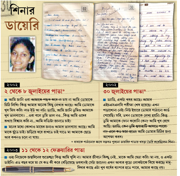 মা ইন্দ্রাণীকে যে কতটা ঘৃণা করতেন, ডায়েরির ছত্রে ছত্রে মিলেছে তার প্রমাণ। ইন্দ্রাণীকে ‘ডাইনি’ বলে উল্লেখ করার পাশাপাশি ইন্দ্রাণী যে তাঁর চরম ক্ষতি করতে পারে, সে আশঙ্কার কথাও লেখা রয়েছে ডায়েরিতে। রয়েছে বাবা সিদ্ধার্তের প্রতি অভিমানও। বাবার সঙ্গে দেখা করতে চাওয়ার আর্জিও জানিয়েছে কিশোরী শিনা। বিভিন্ন সময়ে সিদ্ধার্তের পরামর্শও চেয়েছেন তিনি। তবে ইন্দ্রাণীর সঙ্গে পিটার মুখোপাধ্যায়ের বিয়েকে ভাল চোখে দেখেননি শিনা। ডায়েরির এক জায়গায় লেখা, “এ বার এক বৃদ্ধকে বিয়ে করল মা। দাদু-দিদিমা বিষয়টিকে ভাল ভাবে নিলেও আমি নিইনি। অত্যন্ত ঘৃণ্য কাজ।”