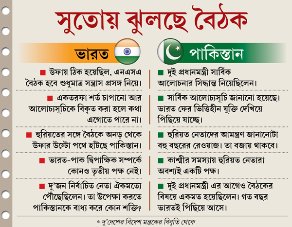 আজ দিল্লির তরফে সরকারি ভাবে ইসলামাবাদকে জানিয়ে দেওয়া হয়— ১) দুই জাতীয় নিরাপত্তা উপদেষ্টা (এনএসএ) অজিত ডোভাল ও সরতাজ আজিজের বৈঠকে কেবল সন্ত্রাস নিয়েই আলোচনা হবে। ২) ডোভালের সঙ্গে বসার আগে বিচ্ছিন্নতাবাদী হুরিয়ত নেতাদের সঙ্গে বৈঠক করতে পারবেন না সরতাজ আজিজ। অর্থাৎ নিরাপত্তা উপদেষ্টাদের বৈঠকে কাশ্মীর সমস্যা নিয়ে কোনও আলোচনায় যে দিল্লির মত নেই, সে কথা স্পষ্ট বুঝিয়ে দেওয়া হয়। এবং বুঝিয়ে দেওয়া হয়, ডোভালের সঙ্গে বৈঠকের পর সরতাজ কাশ্মীরের নেতাদের সঙ্গে কথা বলতে পারেন। কিন্তু মূল বৈঠকে কোনও তৃতীয় পক্ষকে বরদাস্ত করা হবে না।