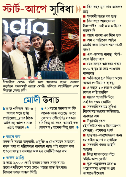 এ দিন বিজ্ঞান মঞ্চের অনুষ্ঠানে নতুন ব্যবসার জন্য নির্দিষ্ট নীতি (স্টার্ট-আপ অ্যাকশন প্ল্যান) ঘোষণা করতে গিয়ে মোদীর দাবি, এ দেশে তার পথ মসৃণ করতে যতটা সম্ভব কম নাক গলাবে তাঁর সরকার। নজরদারির নয়, ভূমিকা হবে সহায়কের। কাজে তার প্রমাণ দিতে নতুন ব্যবসায় প্রথম তিন বছর ইনস্পেক্টরের পা না-পড়ার কথা বলেছেন তিনি। ঘোষণা করেছেন, কর ছাড়, পেটেন্ট আবেদনের খরচ কমানো, ব্যবসায় ঢালার জন্য তহবিল তৈরির কথা। জোর দিয়েছেন এক-জানলা ব্যবস্থা চালুর উপরে। একে তাই বাজেটের আগেই সংস্কারের ইনিংস হিসেবে দেখছেন অনেকে।