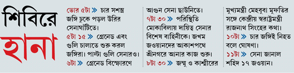 সেনার চপারগুলো টানা চক্কর দিচ্ছে মাথার ওপরে। একটু দূরেই রাজ্য পুলিশের স্পেশ্যাল অপারেশন গ্রুপের গাড়ি। কিন্তু পুলিশকে নাকি ভেতরে যেতে দিচ্ছে না সেনা। শুনলাম, জঙ্গি মোকাবিলায় আকাশ থেকে নামানো হচ্ছে প্যারা-কম্যান্ডো। সবই শুনছি এ দিক-ও দিক থেকে। টিভিতে সরাসরি সম্প্রচারের সুবিধে যাতে জঙ্গিরা নিতে না পারে, তাই চ্যানেলের ওবি ভ্যানগুলোকেও এখানে আটকে দেওয়া হয়েছে। যদিও তত ক্ষণে আমরা জেনেছি, জওয়ানদের তাঁবুতে গ্রেনেড ছুড়ে আগুন লাগিয়ে তারপর ব্রাশ ফায়ার করেছে জঙ্গিরা। এখন কাছাকাছিই কোথাও লুকিয়ে গুলি ছুড়ছে তারা। জবাব দিচ্ছে সেনা।