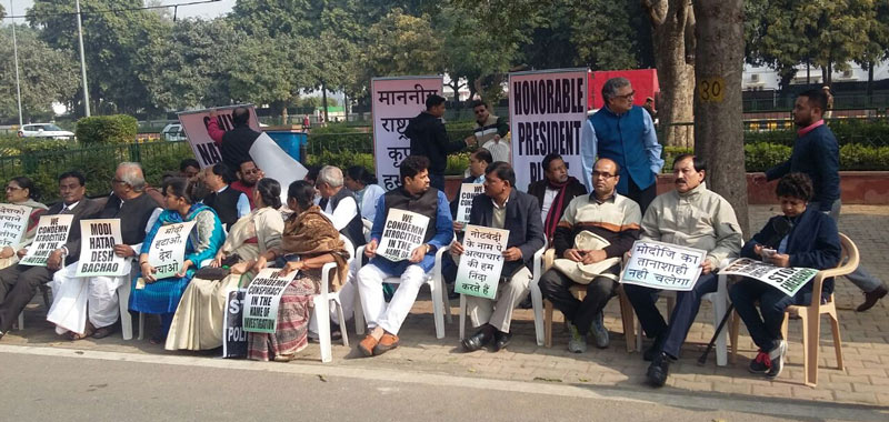 নোট বাতিলের বিরোধিতায় এবং দুই সাংসদের গ্রেফতারির প্রতিবাদে সোমবার দিল্লিতে তৃণমূল বিক্ষোভ দেখাবে বলে আগেই স্থির হয়েছিল। খোদ দলনেত্রীর নির্দেশেই এই সিদ্ধান্ত হয়। তবে দিল্লিতে আজ ঠিক কী কর্মসূচি পালিত হবে, তা তৃণমূল সংসদীয় দল আগে জানায়নি। সংসদ ভবনে তৃণমূলের সংসদীয় দফতরে বেলা ১২টা নাগাদ বৈঠকে বসে কর্মসূচি স্থির করা হবে, এমনটাই জানানো হয়েছিল তৃণমূলের তরফে। কথা মতো বেলা ১২টার মধ্যেই তৃণমূল সাংসদরা একে একে সংসদে পৌঁছে যান। ২৯ জন সাংসদকে নিয়ে বৈঠক শুরু হয়।