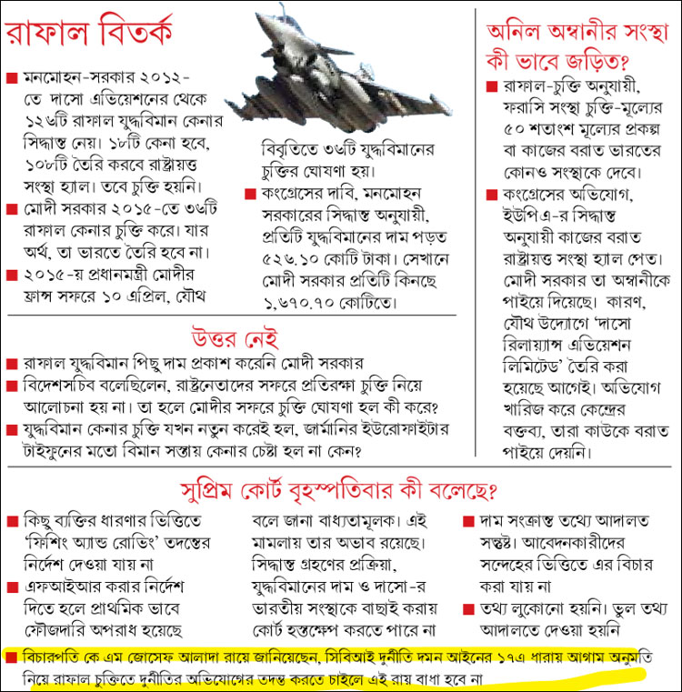 ঠিক ১১ মাস আগে, ২০১৮-র ১৪ ডিসেম্বর সুপ্রিম কোর্ট রাফাল চুক্তি নিয়ে তদন্তের দাবি খারিজ করে দিয়েছিল। কিন্তু তার পরে নতুন নথি প্রকাশ্যে আসে। তার ভিত্তিতে অভিযোগ ওঠে, রাফাল কেনা নিয়ে প্রতিরক্ষা মন্ত্রকের সঙ্গে ফরাসি যুদ্ধবিমান সংস্থা