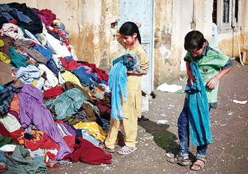 ত্রাণ শিবিরে জামা-কাপড়ের স্তূপ থেকে জামা খুঁজে নিচ্ছে দুই খুদে। সোমবার শ্রীনগরে।