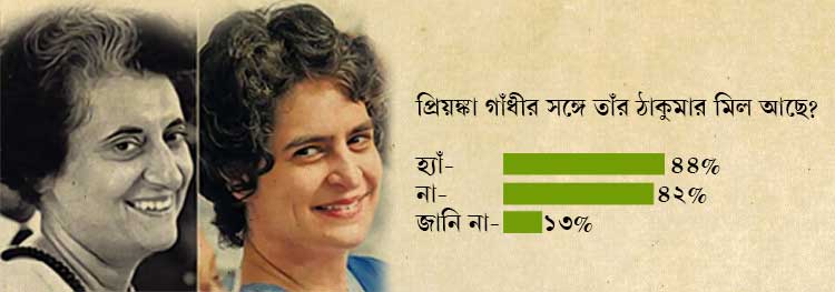 প্রিয়ঙ্কা গাঁধীর সঙ্গে তাঁর ঠাকুমার কোনও মিল আছে? এই প্রশ্নের উত্তরে ৪৪ শতাংশ মানুষ বলেছেন, তাঁরা ইন্দিরার সঙ্গে প্রিয়ঙ্কার মিল খুঁজে পান। ৪২ শতাংশ মানুষ তার উল্টো রায় দিয়েছেন। জানেন না বলেছেন ১৩ শতাংশ মানুষ।