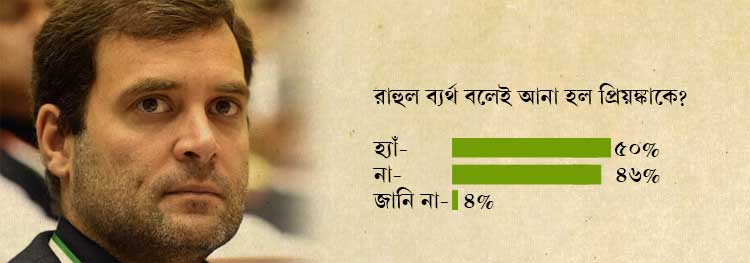 কংগ্রেস সভাপতি পদে রাহুল গাঁধী ব্যর্থ বলেই কি আনা হল প্রিয়ঙ্কা গাঁধীকে? ৫০ শতাংশ মানুষ এরকমটাই মনে করেন বলে সমীক্ষায় জানিয়েছেন। ৪৬ শতাংশ মানুষ এই প্রশ্নের সঙ্গে একমত নন।