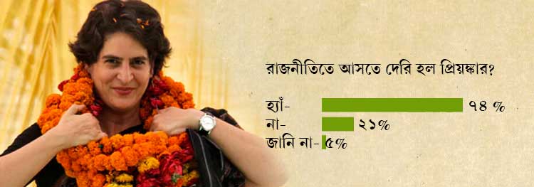 আরেকটি প্রশ্ন ছিল, প্রিয়ঙ্কাকে কি অনেক দেরিতে রাজনীতিতে আনা হল? ৭৪ শতাংশ মানুষ এই প্রশ্নের উত্তরে হ্যাঁ বলেছেন। ২১ শতাংশ মানুষ অবশ্য জানিয়েছেন, রাজনীতিতে আসতে দেরি হয়নি প্রিয়ঙ্কার।