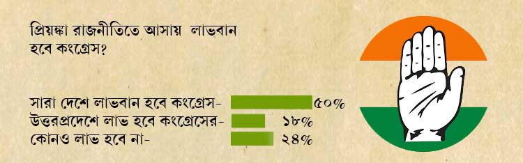 প্রিয়ঙ্কা রাজনীতিতে আসায় উত্তরপ্রদেশ সহ সারা দেশে কংগ্রেস লাভবান হবে কি না , সেই প্রশ্নের উত্তরে ৫০ শতাংশ মানুষ জানিয়েছেন, সারা দেশেই লাভবান হবে কংগ্রেস। ১৮ শতাংশ মানুষ জানিয়েছেন শুধু উত্তরপ্রদেশে লাভবান হবে কংগ্রেস।