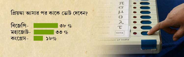 প্রিয়ঙ্কা আসার পর কাকে ভোট দেবেন, এই প্রশ্নের উত্তরে ৩৮ শতাংশ মানুষ বিজেপির পক্ষে রায় দিয়েছেন। ৩৩ শতাংশ মানুষ মহাজোটের পক্ষে এবং কংগ্রেসের পক্ষে রায় দিয়েছেন ১৮ শতাংশ মানুষ।