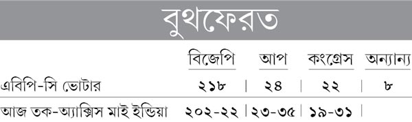 দিনের শেষে বুথফেরত সমীক্ষার ফলও সেই কথাই বলছে। তবে এ বারও প্রায় অর্ধেক ভোটার বুথে যাওয়ার আগ্রহ দেখাননি। আগামী বুধবার দিল্লি পুরভোটের ফলপ্রকাশ। কিন্তু তার আগে বুথফেরত সমীক্ষা বলছে, ত্রিমুখী এই নির্বাচনে ফেভারিট অবশ্যই বিজেপি। কংগ্রেস বা আম আদমি পার্টির তুলনায় অনেক ভাল ফল করে এক নম্বর স্থান পেতে চলেছে তারা। উত্তরপ্রদেশের পরে দিল্লির পুরভোটেও বিপুল জয় পেতে চলেছে নরেন্দ্র মোদীর দল। এ বার জিতলে তিন বার দিল্লি পুরসভায় ক্ষমতা দখল করবে বিজেপি। আর ঘরের মাটিতেও পর্যুদস্ত হতে হবে আপকে।