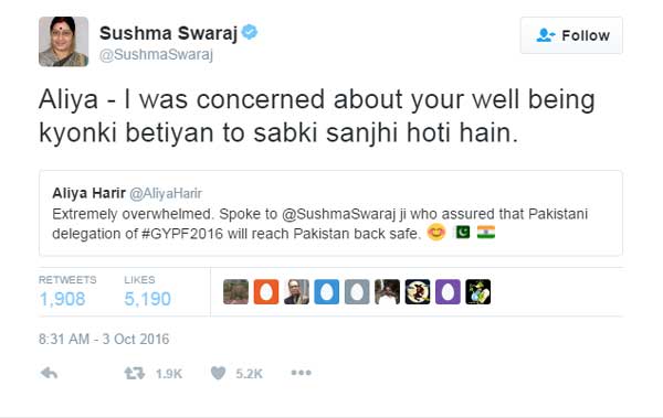 গত পয়লা অক্টোবরে তাই পাক পিস ফোরাম ‘আঘাঝে দোস্তি’র আহ্বায়ক (কনভেনর) আলিয়া হারির দেখা করেছিলেন বিদেশমন্ত্রী সুষমা স্বরাজের সঙ্গে। আরও ১৮ জন পাক তরুণীর সঙ্গে আলিয়া নিজেও চন্ডীগড়ে এসেছিলেন ‘বিশ্ব যুব শান্তি উৎসবে’ যোগ দিতে। তাঁদের সমস্যাটার কথা সবিস্তারে জানিয়েছিলেন সুষমাকে। আর আজ, মঙ্গলবারই টুইট করে বিদেশমন্ত্রী তাঁদের জানিয়ে দিয়েছেন সুখবর। যাতে পাকিস্তানে তরুণীদের স্বজনরাও সেই খবরটা পেয়ে যান তড়িঘড়ি।