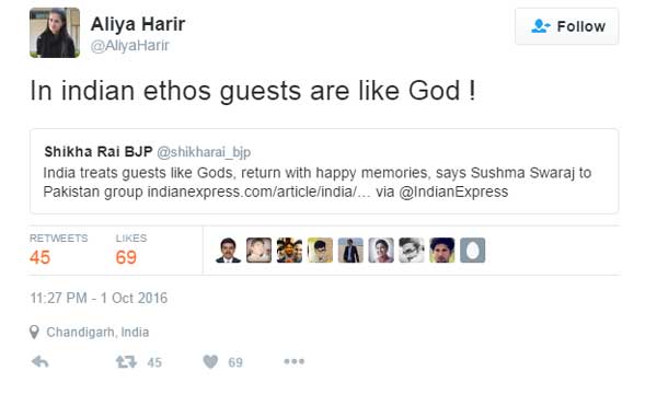 মার্কিন মুলুকের ট্রয় বিশ্ববিদ্যালয়ের ছাত্রী আলিয়া তাঁর টুইটে লিখেছেন, ‘‘আমরা দেবীর মতো আতিথ্য, খাতির-যত্ন পেয়েছি ভারতে।’’