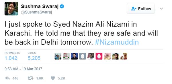 টুইট করে বিদেশমন্ত্রী সুষমা স্বরাজ রবিবার এ খবর দিয়ে বলেছেন, ‘‘এক জন সুফি ধর্মগুরু সৈয়দ নাজিম আলি নিজামির সঙ্গে আমার টেলিফোনে কথা হয়েছে। ওই সুফি ধর্মগুরু এখন করাচিতে রয়েছেন। উনি আমাকে টেলিফোনে বললেন, নিরাপদেই রয়েছেন। কাল, সোমবার দিল্লিতে ফিরে আসছেন।’’