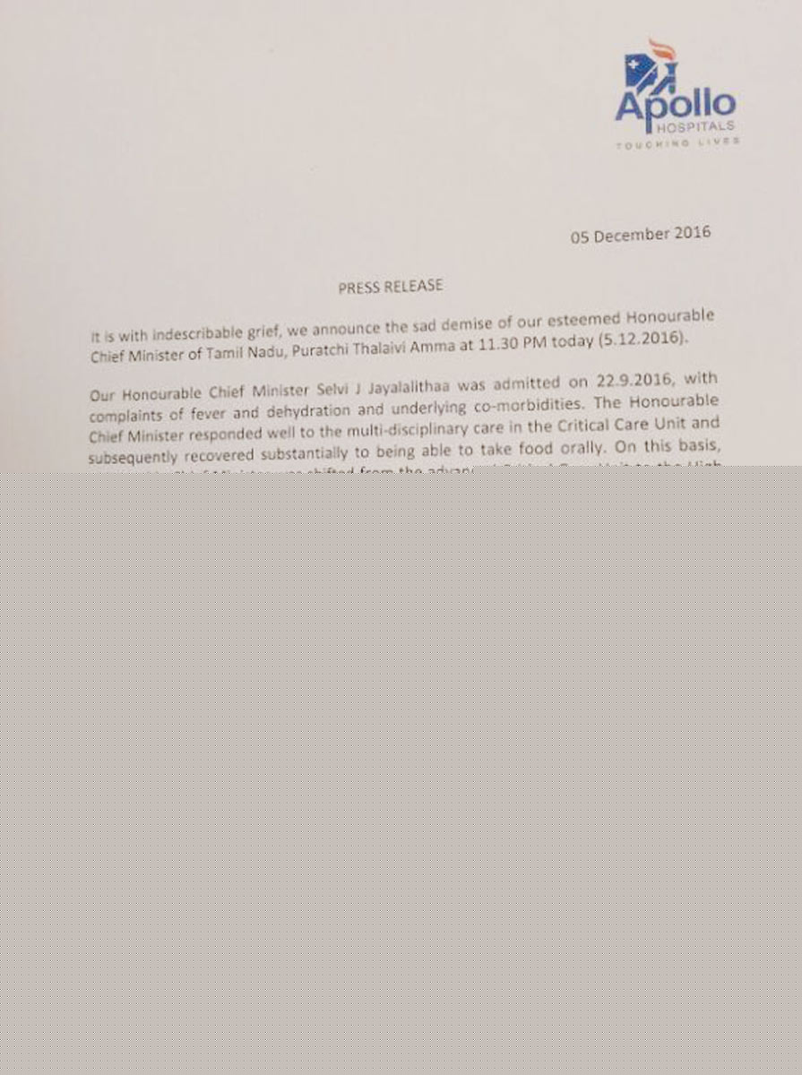 সোমবার সকালে বিভ্রান্তি ছড়িয়েছিল জয়ার দল এবং হাসপাতাল কর্তৃপক্ষের বক্তব্যের মধ্যে আকাশ-পাতাল ফারাকের জেরেই। এআইএডিএমকে মুখপাত্র সিআর সরস্বতী জানিয়েছিলেন, সকালেই একটি অস্ত্রোপচার হয়েছে, চিকিত্সকেরা জানিয়েছেন, আম্মা সুস্থ হয়ে যাবেন। তার পর জয়ার দলের আর এক নেতা পি রামচন্দ্রন দাবি করেছিলেন, আম্মার শারীরিক অবস্থার উন্নতি হচ্ছে বলে চিকিৎসকরা জানিয়েছেন। জয়ার শারীরিক অবস্থা সম্পর্কে খোঁজ নিতে অ্যাপোলো হাসপাতালে পৌঁছেছিলেন এক কংগ্রেস নেতা। তামিলনাড়ুর মুখ্য সচিব পি মোহন রাও ওই কংগ্রেস নেতাকে নাকি জানান, মুখ্যমন্ত্রী ভাল আছেন। কিন্তু অ্যাপোলো হাসপাতাল কর্তৃপক্ষ এই সব দাবি নস্যাৎ করে দেয়। মেডিক্যাল বুলেটিন প্রকাশ করে হাসপাতালের তরফে জানানো হয়, সোমবার সকালে জয়ললিতার হৃদযন্ত্রে কোনও অস্ত্রোপচার হয়নি। তাঁকে একস্ট্রাকর্পোরিয়াল মেমব্রেন অক্সিজেনেশন বা একমো নামের একটি জীবনদায়ী ব্যবস্থার মধ্যে রাখা হয়েছে। চিকিৎসকরা জানিয়েছিলেন, রবিবার সন্ধ্যায় হার্ট অ্যাটাক হওয়ার পর থেকে মুখ্যমন্ত্রীর অবস্থা এতই সঙ্কটজনক যে এই একমো ব্যবস্থার মাধ্যমে তাঁর হৃদযন্ত্র ও ফুসফুসের স্বাভাবিক ক্রিয়া নিশ্চিত রাখার চেষ্টা করা হচ্ছে। অ্যাপোলো কর্তৃপক্ষের অনুরোদে নয়াদিল্লির এইমস থেকে চার বিশেষজ্ঞ চিকিৎসকের একটি দলকেও চেন্নাই পাঠানো হয়েছিল। কিন্তু কোনও ব্যবস্থাই কাজে এল না। চিকিৎসকদের আপ্রাণ চেষ্টা ব্যর্থ করে চলে গেলেন জয়রাম জয়ললিতা।