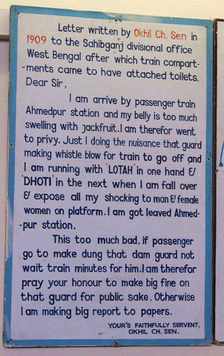 (“আমি আহমেদপুর স্টেশনে পৌঁছলাম। কাঁঠাল খাওয়ার জন্য আমরা পেট ফুলতে শুরু করে। স্টেশনে নেমে শৌচকর্ম করতে যাই। কাজ শেষ করে উঠতে যাব, তখনি গার্ড ট্রেন ছাড়ার জন্য বাঁশি বাজালেন। এক হাতে লোটা অন্য হাতে ধুতি ধরে ট্রেন ধরার জন্য ছুট লাগালাম। আমি পড়ে গেলাম। স্টেশনে দাঁড়িয়ে থাকা পুরুষ ও মহিলারা আমার দিকে অবাক দৃষ্টিতে তাকিয়ে থাকল। আহমেদপুর স্টেশনেই আমাকে অপেক্ষা করতে হল। এটা খুব খারাপ বিষয় হয়েছে। যদি কোনও যাত্রী শৌচকর্মের জন্য যায়, কয়েক মিনিট ট্রেনটাকে দাঁড় করাতে পারল না গার্ড? এই কারণেই আপনার কাছে আমার অনুরোধ ওই গার্ডের জরিমানা করা হোক, নাহলে এই খবরটা খবরের কাগজে দিয়ে দেব।”)
