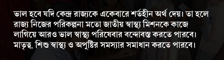 ভাল হবে যদি কেন্দ্র রাজ্যকে একেবারে শর্তহীন অর্থ দেয়। তা হলে রাজ্য নিজের পরিকল্পনা মতো জাতীয় স্বাস্থ্য মিশনকে কাজে লাগিয়ে আরও ভাল স্বাস্থ্য পরিষেবার বন্দোবস্ত করতে পারবে। মাতৃত্ব, শিশু স্বাস্থ্য ও অপুষ্টির সমস্যার সমাধান করতে পারবে। কেন্দ্রীয় প্রকল্পের উদ্দেশ্য এটা কখনও-ই হতে পারে না যে রাজ্য নিজের বরাদ্দ কমিয়ে কেন্দ্রের অর্থ কাজে লাগাবে। বরঞ্চ কেন্দ্রীয় অর্থ দিয়ে রাজ্যকে উৎসাহিত করা উচিত, যাতে রাজ্যগুলি যেখানে ঘাটতি রয়েছে, সেখানে আরও অর্থ ঢালে। জাতীয় স্বাস্থ্য মিশনের পরিসংখ্যান কিন্তু তার উল্টো গল্পই বলে।