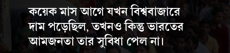 গত কয়েক দিন ধরে কলকাতা-সহ ভারতের বিভিন্ন শহরে পেট্রোল ও ডিজেলের দাম ক্রমাগত উর্ধ্বমুখী। পেট্রোল লিটার প্রতি ৭১.৩৯ টাকা ও ডিজেল ৬২.০৬ টাকা দিল্লিতে। কারণ হিসাবে আসছে আন্তর্জাতিক মূল্য বৃদ্ধি অপরিশোধিত তেলের। এখন এক ব্যারল তেলের আন্তর্জাতিক মূল্য প্রায় ৭০ ডলার। সরকারি মুখপাত্র বার বার মনে করিয়ে দিচ্ছেন যে এখন আন্তর্জাতিক মূল্যের সঙ্গে ভারতের তেলের দাম প্রতি দিন ওঠে নামে। কথাটা অর্ধসত্য। মূল্য ওঠে ঠিকই, কিন্তু কমে না। কয়েক মাস আগে যখন বিশ্ববাজারে দাম পড়েছিল, তখনও কিন্তু ভারতের আমজনতা তার সুবিধা পেল না কারণ কেন্দ্রীয় সরকার ক্রমাগত শুল্ক বাড়িয়ে নিজের কোষাগার ভরিয়ে ফেলল।