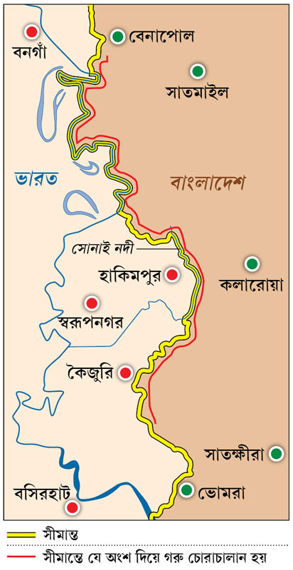গোয়েন্দারা বলছেন কাঁটাতারের বেড়ার কল্যাণে সীমান্তের অন্য এলাকা দিয়ে গরু পাচার অনেকটাই এখন বন্ধ। আর তাতেই সাতমাইল হাটের এই বাড়বাড়ন্ত। ভারত থেকে প্রায় সব গরুই এখন উত্তর ২৪ পরগনার আংরাইল, হাকিমপুর, স্বরূপনগর, কৈজুরি হয়ে বাংলাদেশের সীমান্তে আসে। পেট্রাপোলের ঠিক নীচে থেকে শার্সা, কলারোয়া, ভোমরা পর্যন্ত বিস্তীর্ণ এলাকায় নদী আর জলা-বাওড়ে এলোমেলো সীমান্ত। গরুর দলকে জলে নামিয়ে ভারত থেকে নিয়ে আসা হয় বাংলাদেশে। গোয়েন্দারা বলছেন, গরুর সঙ্গে চালান হয় মাদক, অস্ত্র ও বিস্ফোরকও। ভারতের প্রত্যন্ত জায়গায় জাল নোট ছড়ানোর প্রধান মাধ্যম গরু ব্যবসায়ীর দল। গো-হাটুরে সেজে দিব্যি সীমান্ত পেরিয়ে যাতায়াত করে সাধারণ অপরাধী থেকে ফেরার জঙ্গিরা।