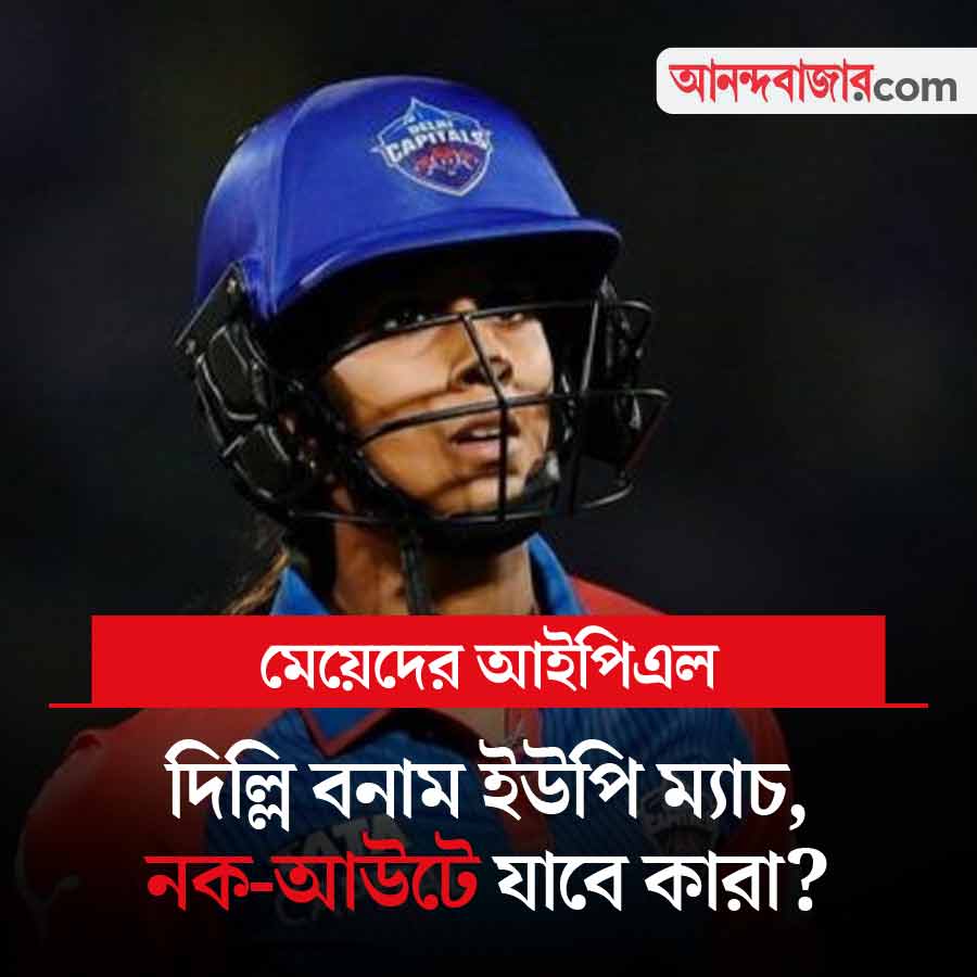 মেয়েদের আইপিএলে রাউন্ড রবিন লিগের শেষ ম্যাচ আজ। মুখোমুখি দিল্লি ক্যাপিটালস ও ইউপি ওয়ারিয়র্স। এই ম্যাচের উপর নির্ভর করেছে প্লে-অফে শেষ দল হিসাবে কারা যাবে। রয়্যাল চ্যালেয়ঞ্জার্স বেঙ্গালুরু গ্রুপ শীর্ষে থেকে আগেই ফাইনালে চলে গিয়েছে। গুজরাত জায়ান্টসও এলিমিনেটরে জায়গা পাকা করে নিয়েছে। বাকি একটি জায়গার জন্য লড়াই দিল্লি, মুম্বই এবং ইউপির। খেলা শুরু সন্ধ্যা ৭:৩০ থেকে। খেলা দেখা যাবে স্টার স্পোর্টস চ্যানেল ও জিয়োহটস্টার অ্যাপে।