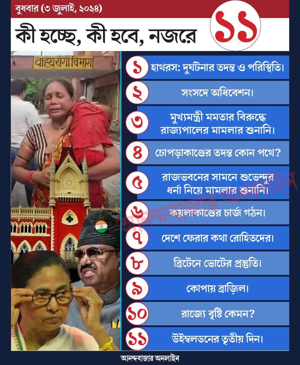 হাথরসের ঘটনায় প্রশাসনের ভূমিকা নিয়ে ইতিমধ্যেই প্রশ্ন উঠতে শুরু করেছে। আলোচনা তৈরি হয়েছে এই বিপর্যয়ের কারণ নিয়ে। পদপিষ্ট হয়ে মৃত্যুর ঘটনায় আয়োজক সৎসঙ্গ কমিটিকে দায়ী করছেন অনেকে। অনেকে প্রশাসনের দিকে আঙুল তুলেছেন। আবার অনেকের দাবি, আগত ‘ভক্ত’দের হু়ড়োহুড়ির কারণেই এই ঘটনা। হাথরসের ঘটনায় ইতিমধ্যেই একটি তদন্ত কমিটি গঠনের নির্দেশ দিয়েছেন উত্তরপ্রদেশের মুখ্যমন্ত্রী। সেই কমিটির নেতৃত্বে থাকবেন আগরার অতিরিক্ত ডিজিপি। আজ হাথরসের দুর্ঘটনার তদন্ত ও পরিস্থিতির দিকে নজর থাকবে।