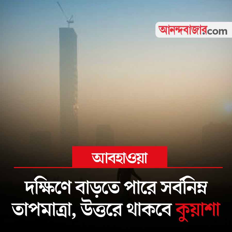 দক্ষিণবঙ্গে ধীরে ধীরে বাড়তে পারে সর্বনিম্ন তাপমাত্রা। উত্তরবঙ্গের দার্জিলিং, জলপাইগুড়ি, কোচবিহার, উত্তর দিনাজপুরে ভোরবেলা থাকবে কুয়াশার দাপট। দৃশ্যমানতা নামতে পারে। রাজ্যে বৃষ্টির কোনও সম্ভাবনা নেই আপাতত।