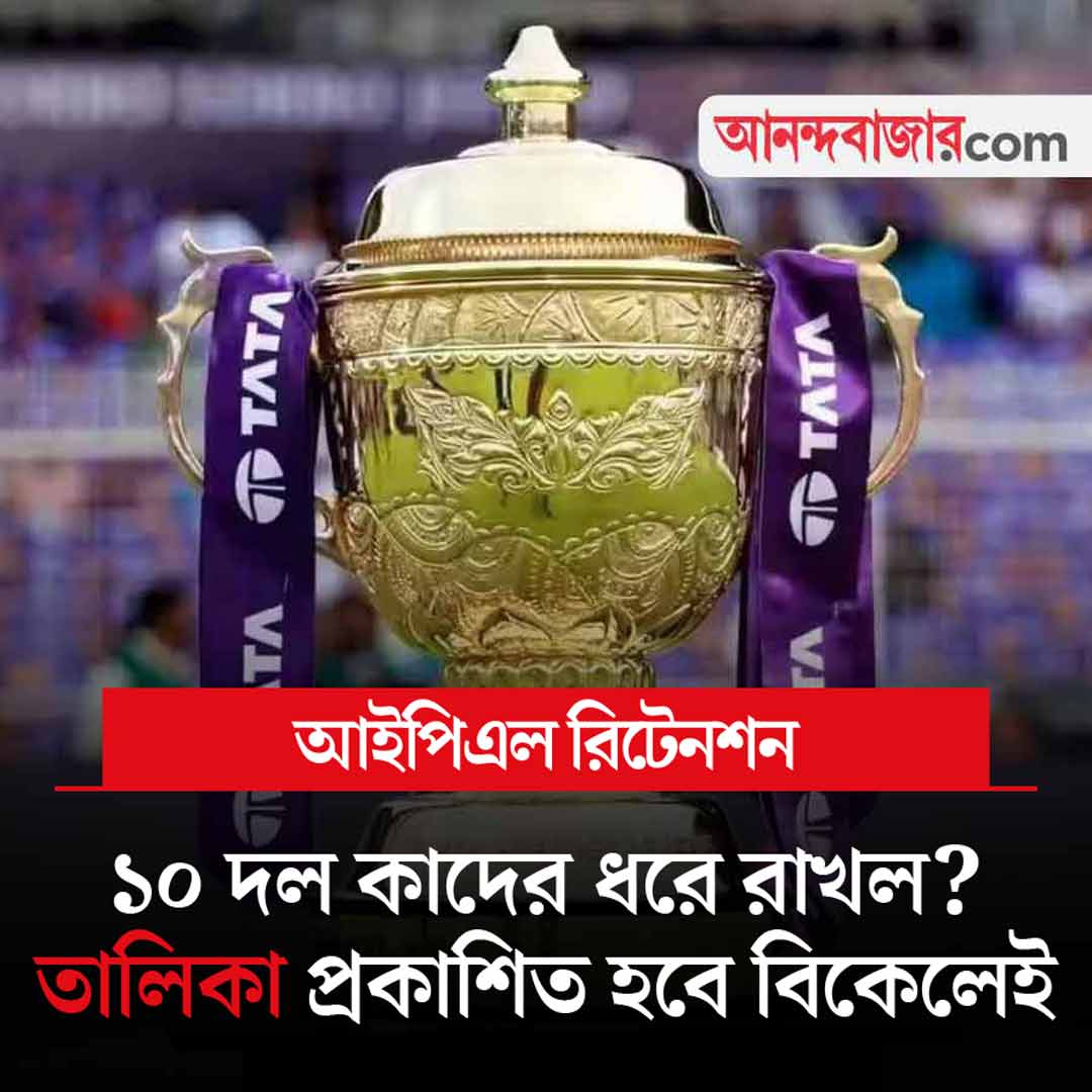 আজ আইপিএলের রিটেনশন। ১০টি দলই আজ জানিয়ে দেবে আগামী আইপিএলের জন্য তারা কোন ক্রিকেটারদের ধরে রাখছে। কেকেআর কি ছেড়ে দেবে ২৩ কোটি ৭৫ লক্ষ টাকা দিয়ে কেনা বেঙ্কটেশ আয়ারকে? সঞ্জু স্যামসনকে কি রাখবে রাজস্থান রয়্যালস? এই সব প্রশ্নেরই জবাব পাওয়া যাবে আজ। বিকেল ৫টায় প্রকাশিত হবে ১০ দলের রিটেনশন তালিকা। সম্প্রচার হবে স্টার স্পোর্টস চ্যানেল ও জিয়োহটস্টার অ্যাপে।