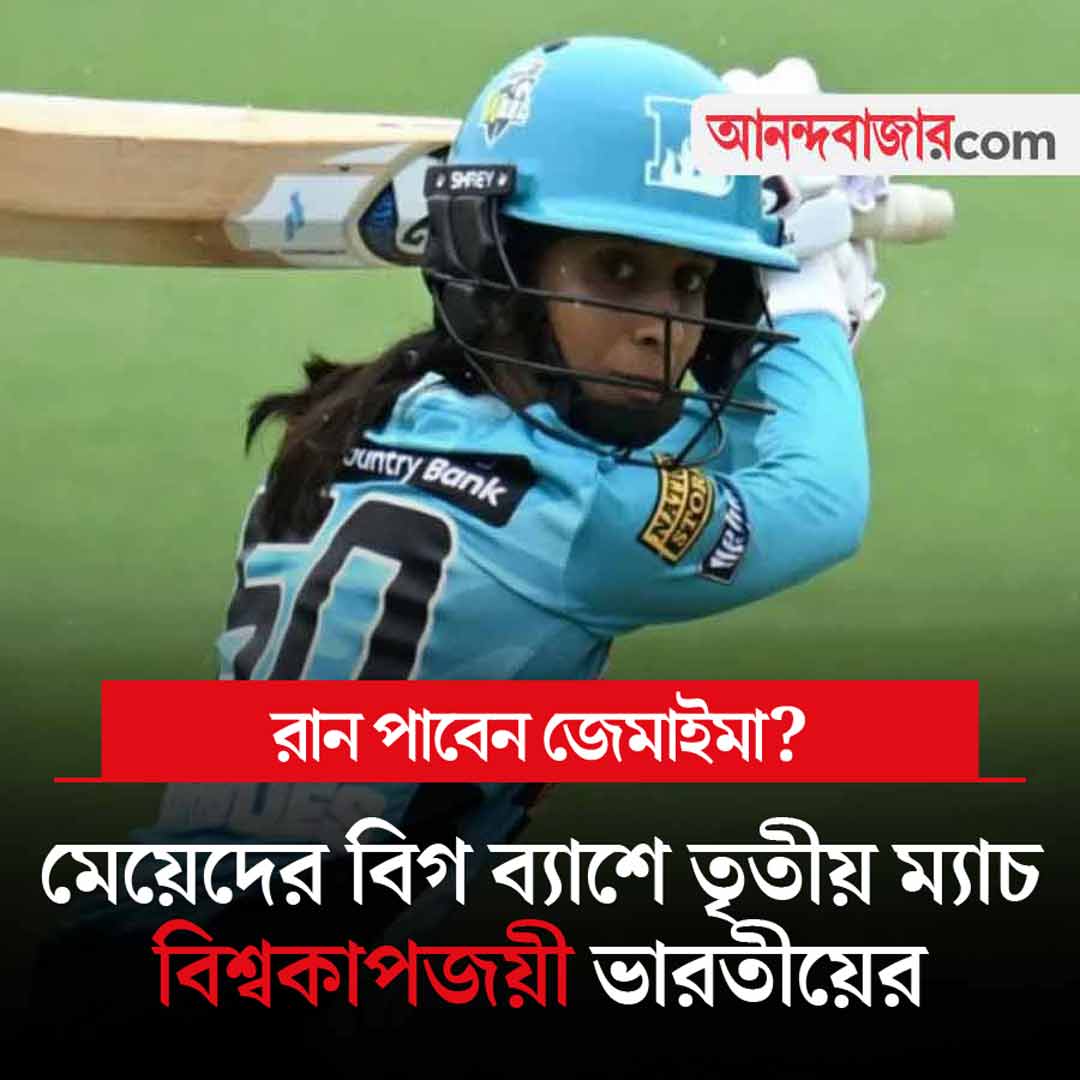 বিশ্বকাপ জেতার পর এখন অস্ট্রেলিয়ায় মেয়েদের বিগ ব্যাশ লিগে খেলছেন জেমাইমা রদ্রিগেজ়। আজ তাঁর ব্রিসবেন হিট মুখোমুখি হোবার্ট হারিকেন্সের। প্রথম দু’টি ম্যাচে ৬ এবং ১১ রান করেছেন জেমাইমা। দু’টি ম্যাচেই হেরেছে ব্রিসবেন। পয়েন্ট তালিকায় সকলের নীচে রয়েছে জেমাইমার দল। আজ ঘুরে দাঁড়ানোর পালা। রান পাবেন জেমাইমা? খেলা শুরু সকাল ১০:১০ থেকে। খেলা দেখা যাবে স্টার স্পোর্টস চ্যানেলে।