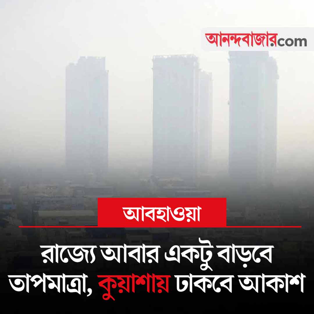আলিপুর হাওয়া অফিস বলছে, রাজ্যে আপাতত ঝড়বৃষ্টির কোনও সম্ভাবনা নেই। দক্ষিণবঙ্গের সব জেলায় রবি থেকে মঙ্গলবার ভোরবেলা আকাশ থাকবে কুয়াশাচ্ছন্ন। দৃশ্যমানতা নামতে পারে ২০০ মিটারে। জেলার সব জায়গায় যদিও কুয়াশা থাকবে না। কিছু এলাকায়। আগামী দু’দিন রাজ্যে রাতের তাপমাত্রার হেরফের হবে না। কোনও কোনও জায়গায় রাতের তাপমাত্রা স্বাভাবিকের থেকে ২ থেকে ৩ ডিগ্রি সেলসিয়াস কমতে পারে। তার পরের তিন দিন তাপমাত্রা ধীরে ধীরে ২ থেকে ৩ ডিগ্রি সেলসিয়াস বাড়তে পারে।